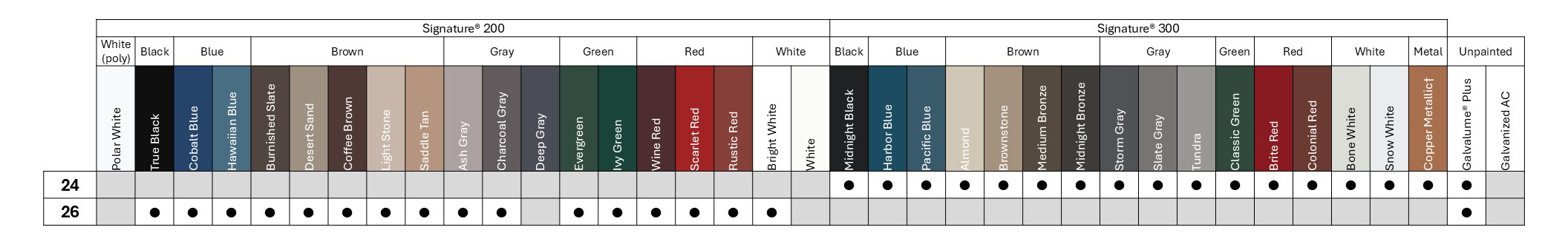 - 24 gauge Signature® 300 polyvinylidene fluoride paint system (select colors)